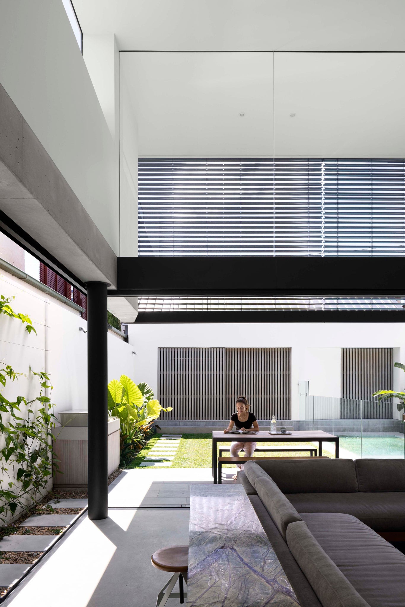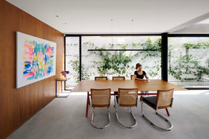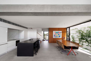 Caroline collaborated with Chapman Architecture to achieve this vision. REDDIE House is a contemporary two-story home that you could describe as the layout of a Balinese Villa in a brutalist architectural shell.
