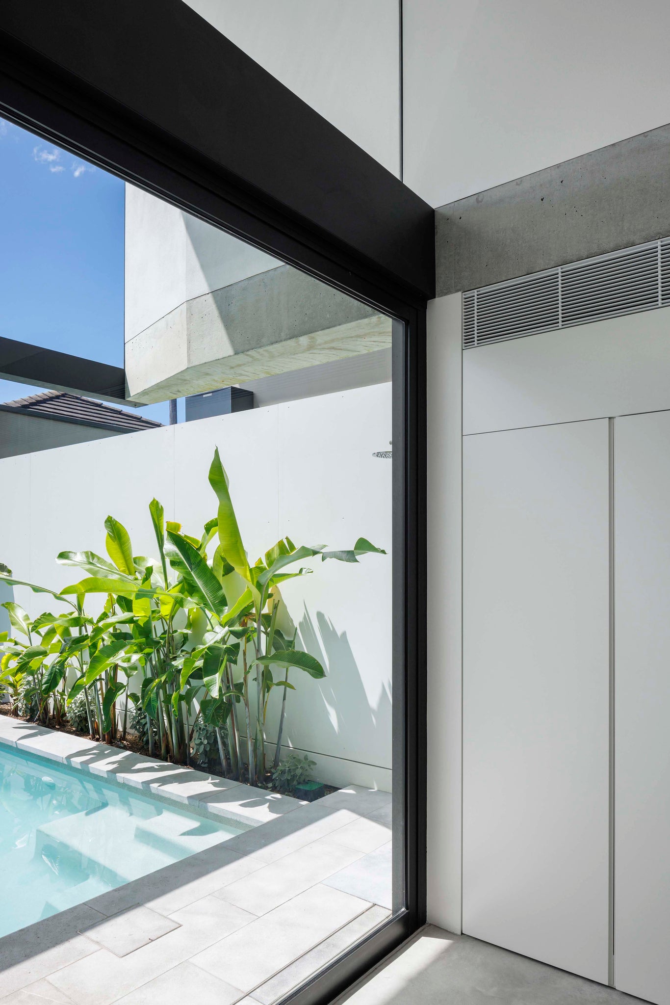 The heart of the home is its double-height living room made of cantilevered concrete beams, which contains a spacious kitchen, lounge, and dining area. This communal space spills outdoors through expansive glazed walls toward the pool and lush landscaped garden, making the 350-square-meter block feel almost double its size. Days here are filled with entertaining, as the sliding doors are stacked back, and children and friends spill out into the backyard and pool.