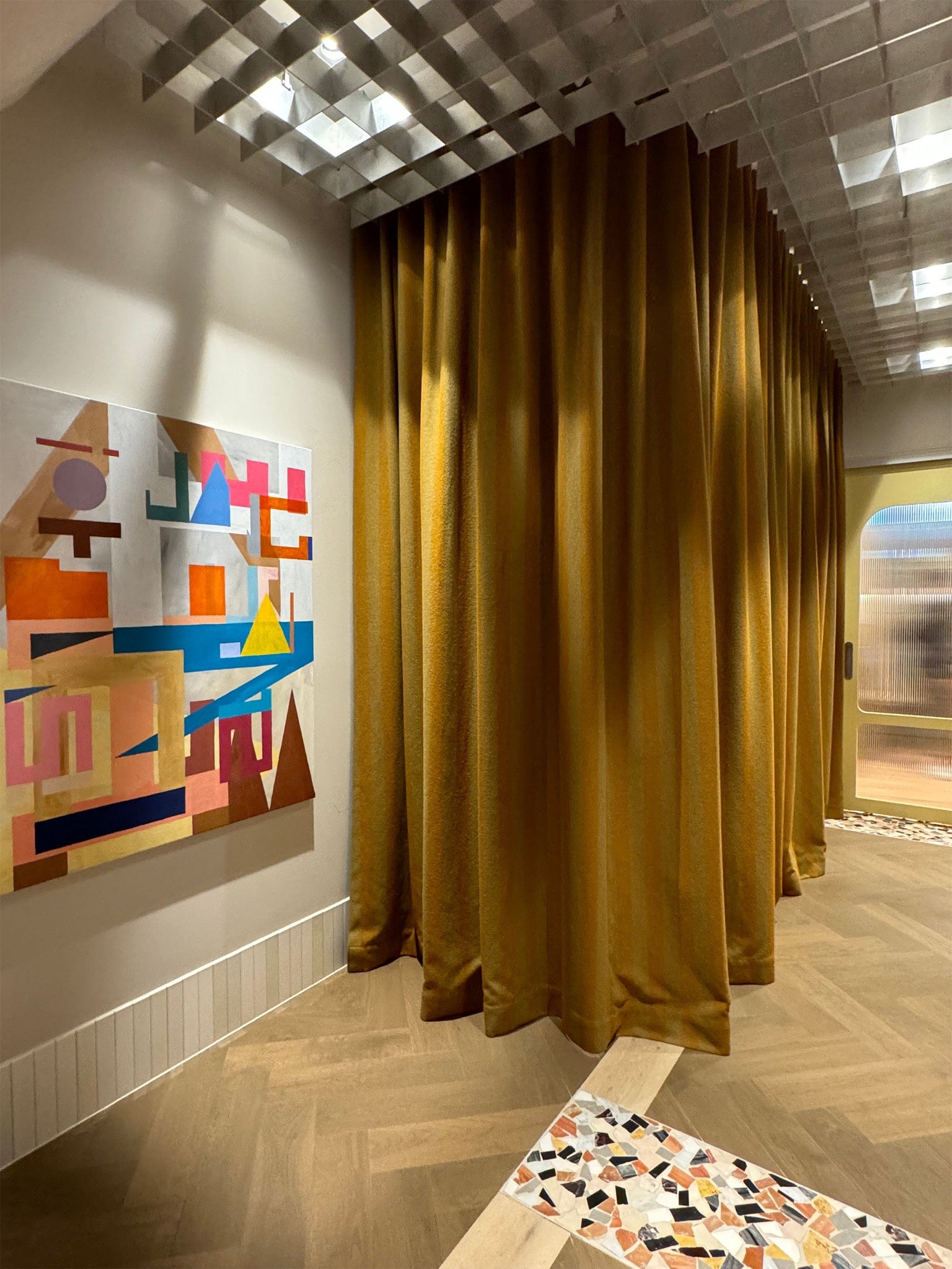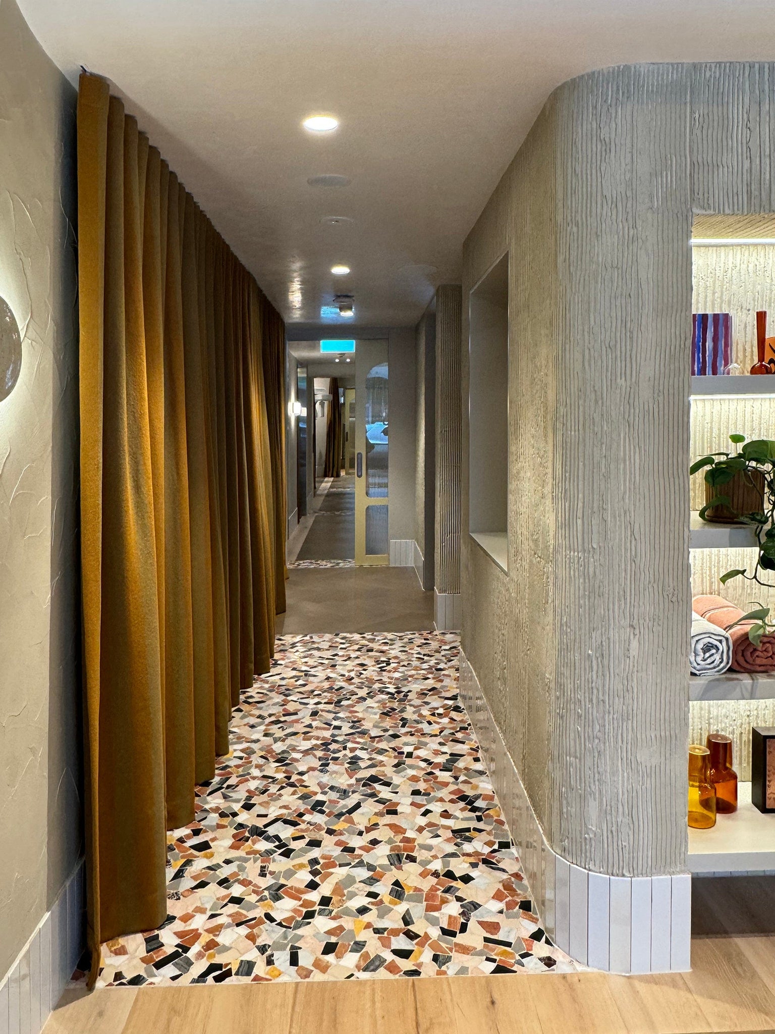 As you enter the reception, an instant calm envelops you—an oasis of textures and details curated for relaxation but avoiding intimidation. Greeted warmly by a receptionist that feels like a friend, the reception desk, is not just functional but an art piece in, muted pink tones of curved metal, marble, and mosaics.