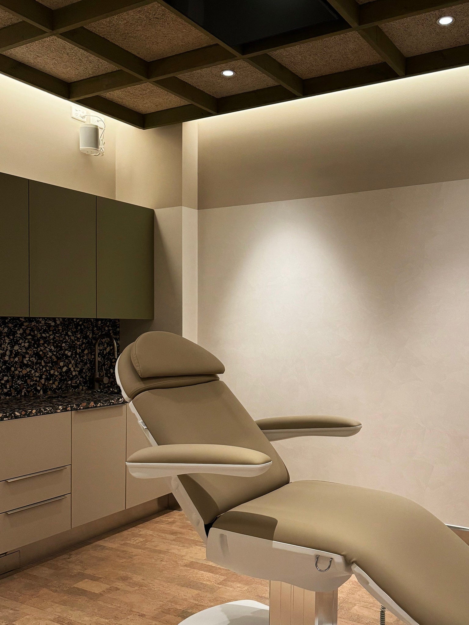 Corbin's attention to detail bleeds into his service. Upon entering the dentists room, a digital screen welcomes you with your name. A TV discreetly blends into the ceiling's timber lattice above the chair, accompanied by noise-canceling headphones for an immersive experience. All machinery is thoughtfully concealed, allowing you to savour the moment without distraction. Even the dental chair, typically vibrant green or blue, is a muted earthy tones adding warmth.