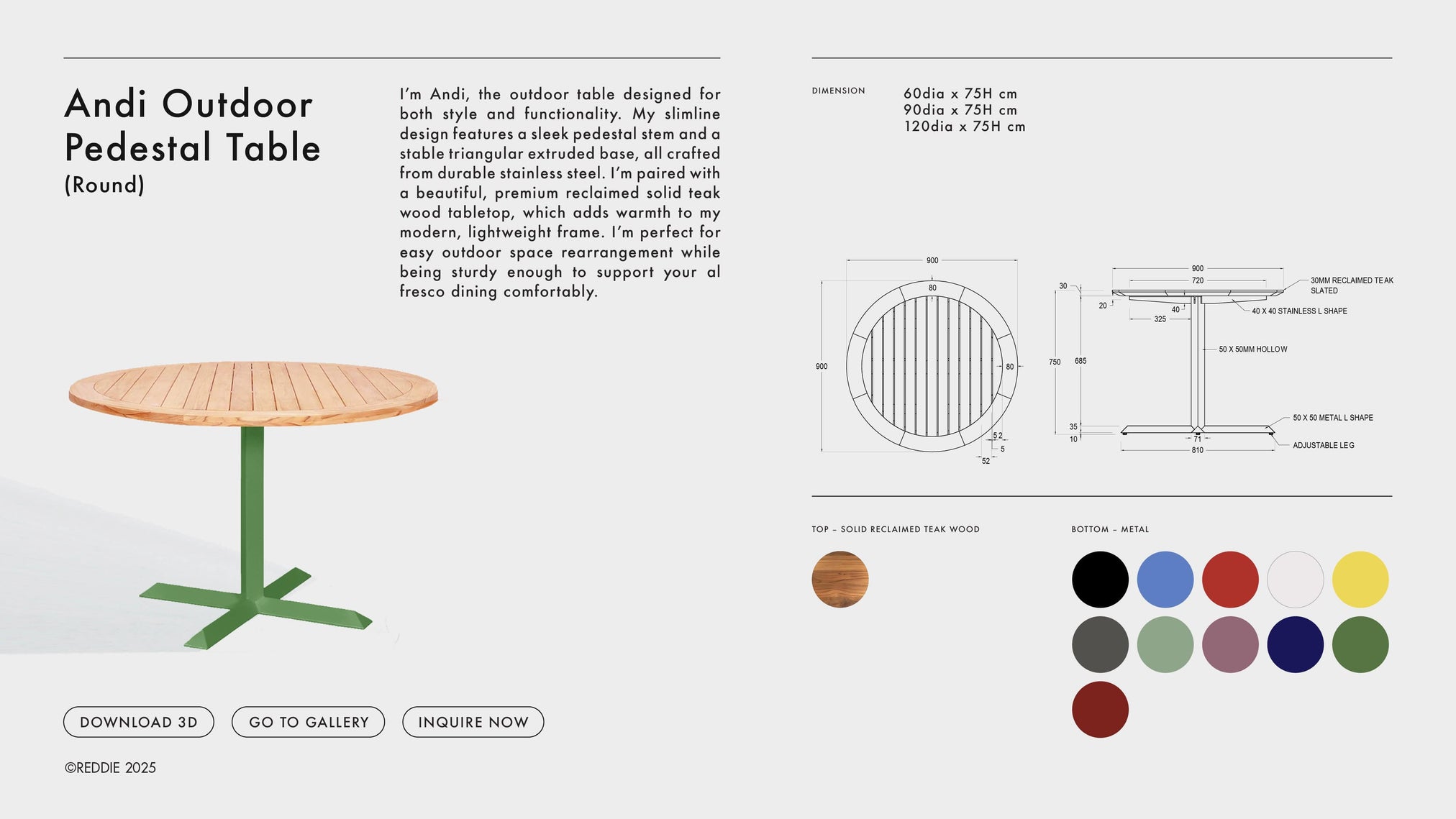 I’m Andi, the outdoor table designed for both style and functionality. My slimline design features a sleek pedestal stem and a stable triangular extruded base, all crafted from durable stainless steel. I’m paired with a beautiful, premium reclaimed solid teak wood tabletop, which adds warmth to my modern, lightweight frame. I’m perfect for easy outdoor space rearrangement while being sturdy enough to support your al fresco dining comfortably.