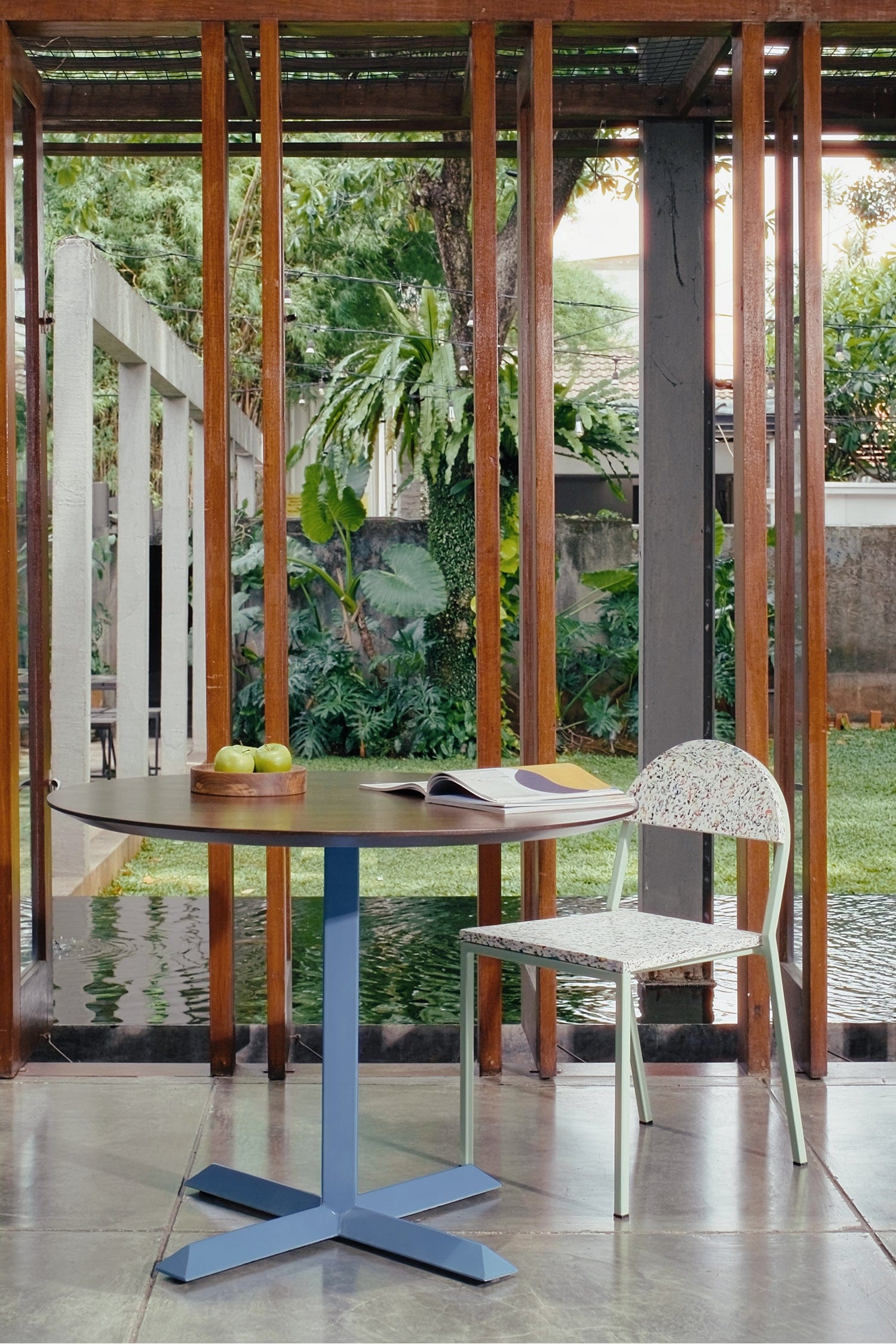 I'm Andi! I'm a slimline pedestal table featuring a sleek, architectural stem and base. Crafted from reclaimed solid teak wood, my top exudes warmth and natural beauty. The 'shark nose' edge detail creates a thin, delicate appearance, giving the impression that my top is floating above the base, making me a stylish addition to any space.