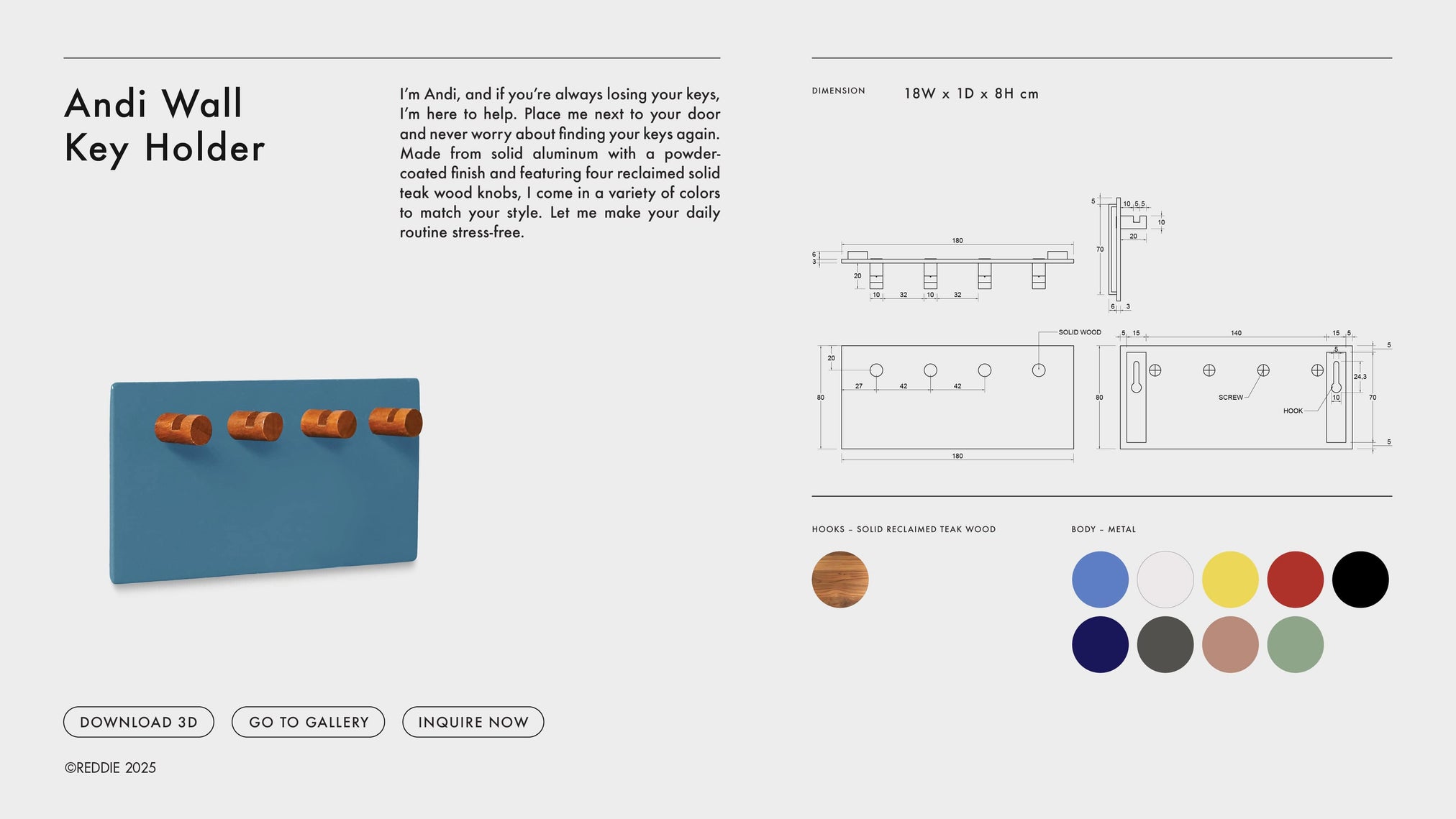 I’m Andi, and if you’re always losing your keys, I’m here to help. Place me next to your door and never worry about finding your keys again. Made from solid aluminum with a powder-coated finish and featuring four reclaimed solid teak wood knobs, I come in a variety of colors to match your style. Let me make your daily routine stress-free.