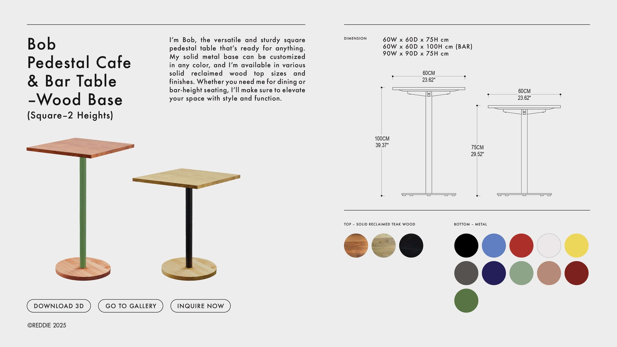 I’m Bob, the versatile and sturdy square pedestal table that’s ready for anything. My solid metal base can be customized in any color, and I’m available in various solid reclaimed wood top sizes and finishes. Whether you need me for dining or bar-height seating, I’ll make sure to elevate your space with style and function.