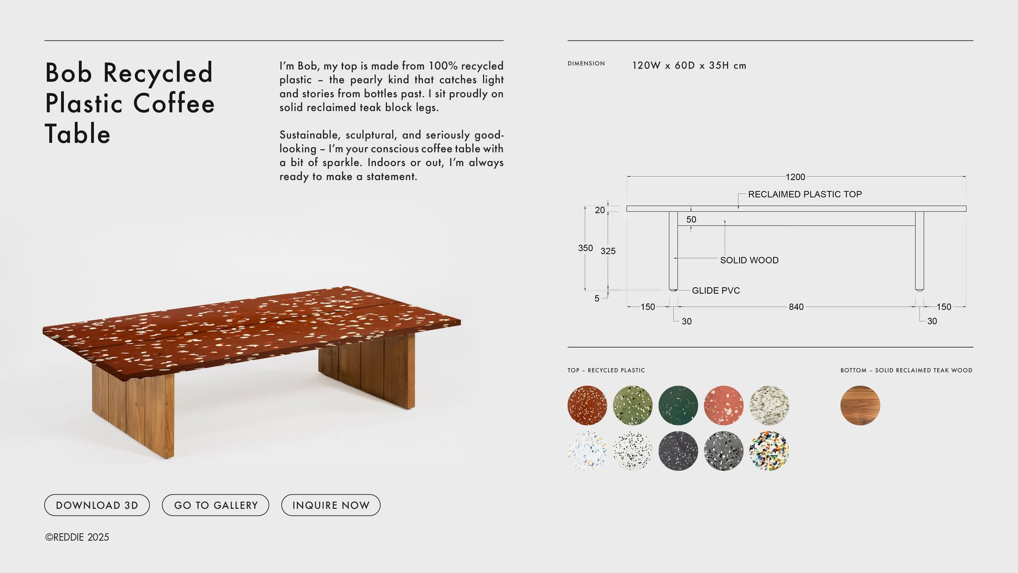 I’m Bob, my top is made from 100% recycled plastic – the pearly kind that catches light and stories from bottles past. I sit proudly on solid reclaimed teak block legs.