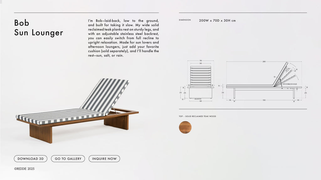 I'm Bob—laid-back, low to the ground, and built for taking it slow. My wide solid reclaimed teak planks rest on sturdy legs, and with an adjustable stainless steel backrest, you can easily switch from full recline to upright relaxation. Made for sun lovers and afternoon loungers, just add your favorite cushion (sold separately), and I’ll handle the rest—sun, salt, or rain.