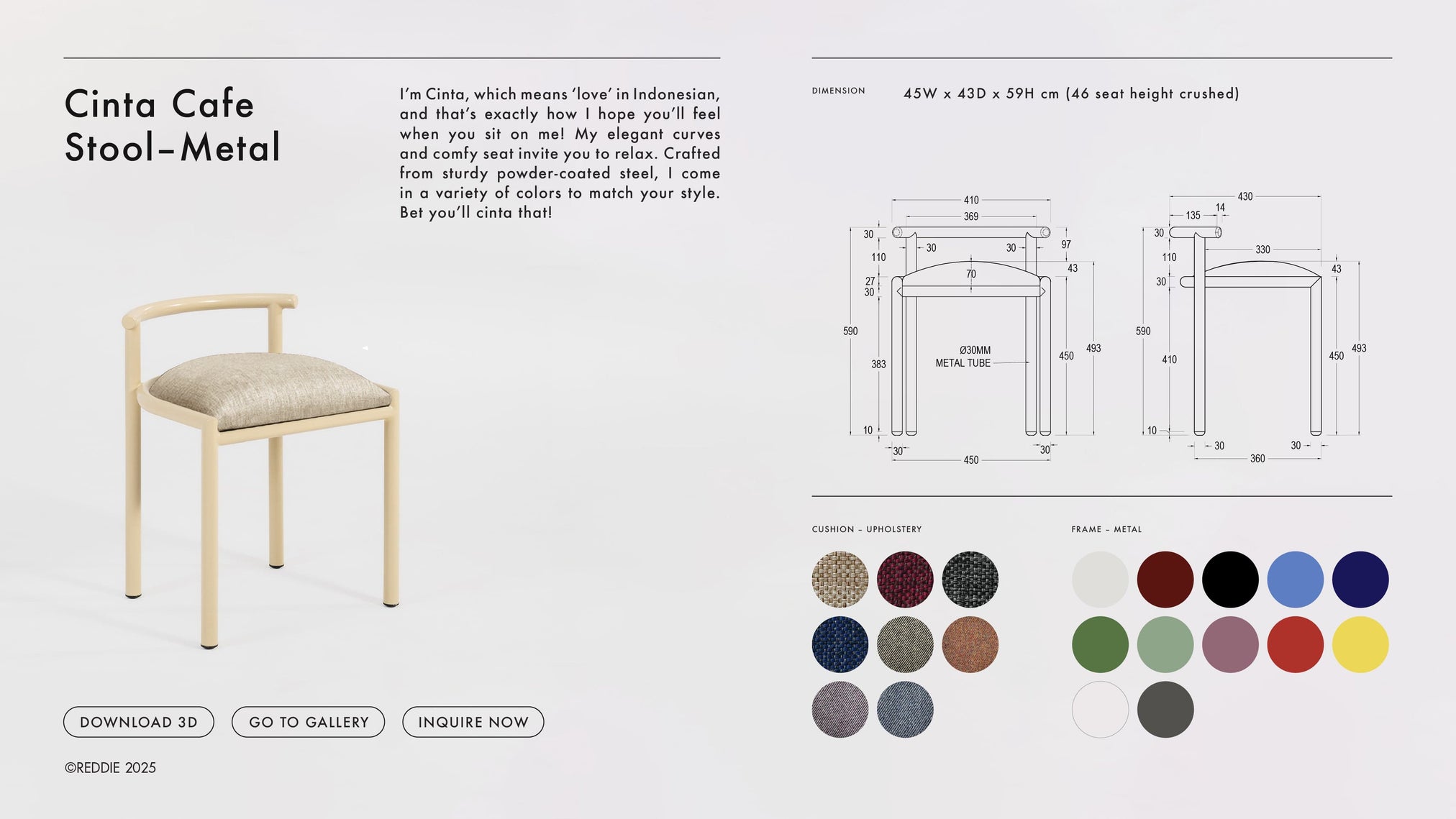 I'm Cinta, which means 'love' in Indonesian, and that's exactly how I hope you'll feel when you sit on me! My elegant curves and comfy seat invite you to relax. Crafted from sturdy powder-coated steel, I come in a variety of colors to match your style. Bet you'll cinta that!