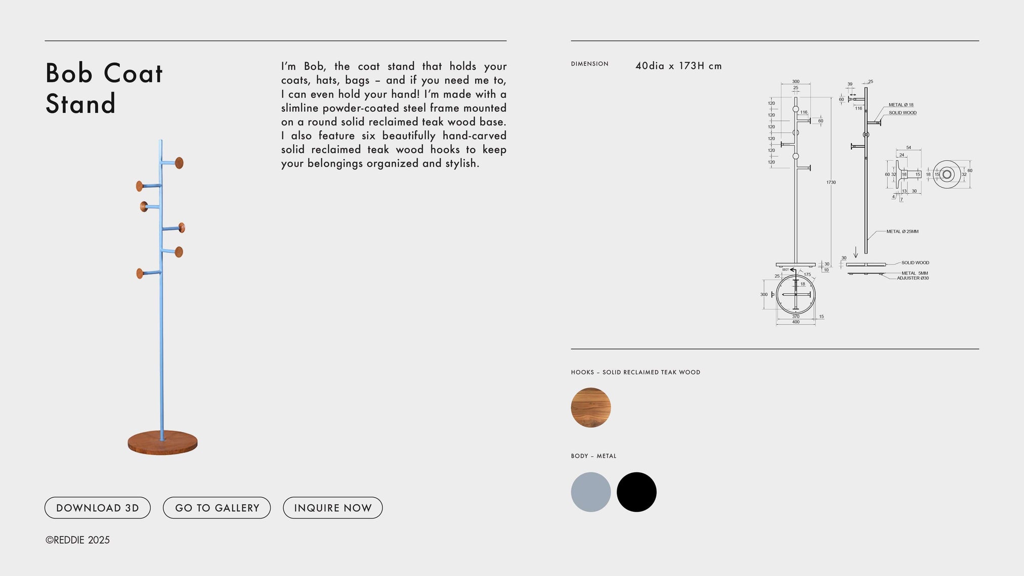 I’m Bob, the coat stand that holds your coats, hats, bags – and if you need me to, I can even hold your hand! I’m made with a slimline powder-coated steel frame mounted on a round solid reclaimed teak wood base. I also feature six beautifully hand-carved solid reclaimed teak wood hooks to keep your belongings organized and stylish.