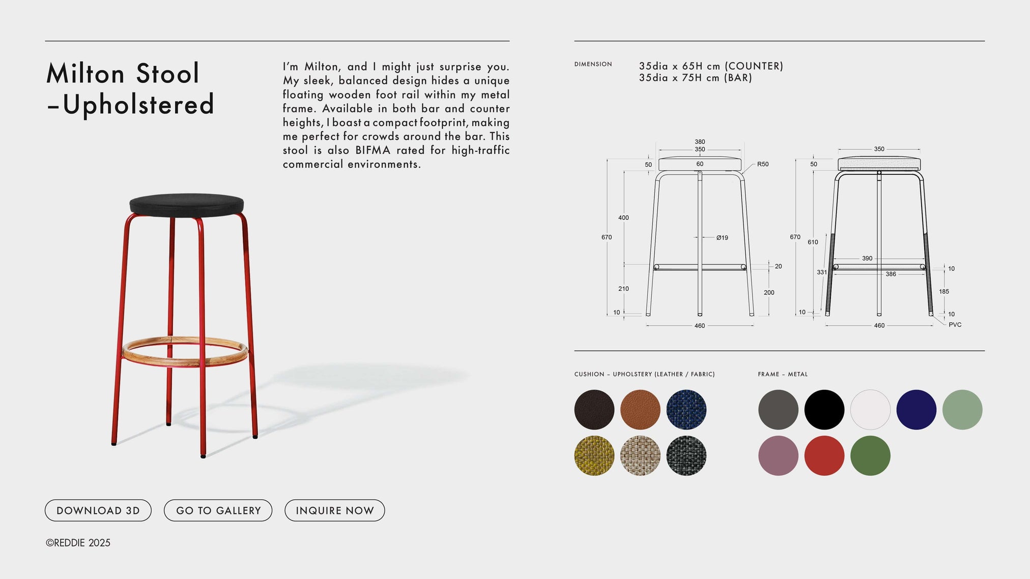 I’m Milton, and I might just surprise you. My sleek, balanced design hides a unique floating wooden foot rail within my metal frame. Available in both bar and counter heights, I boast a compact footprint, making me perfect for crowds around the bar. This stool is also BIFMA rated for high-traffic commercial environments.