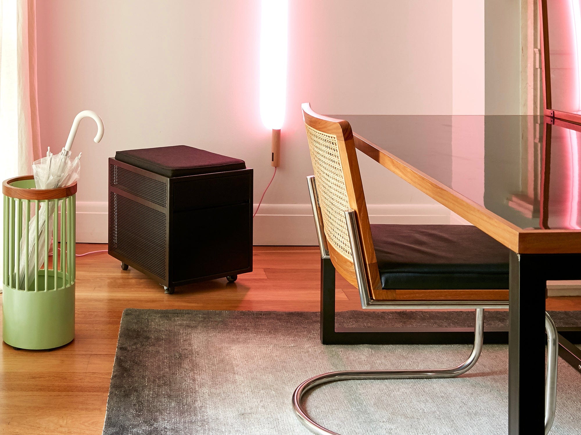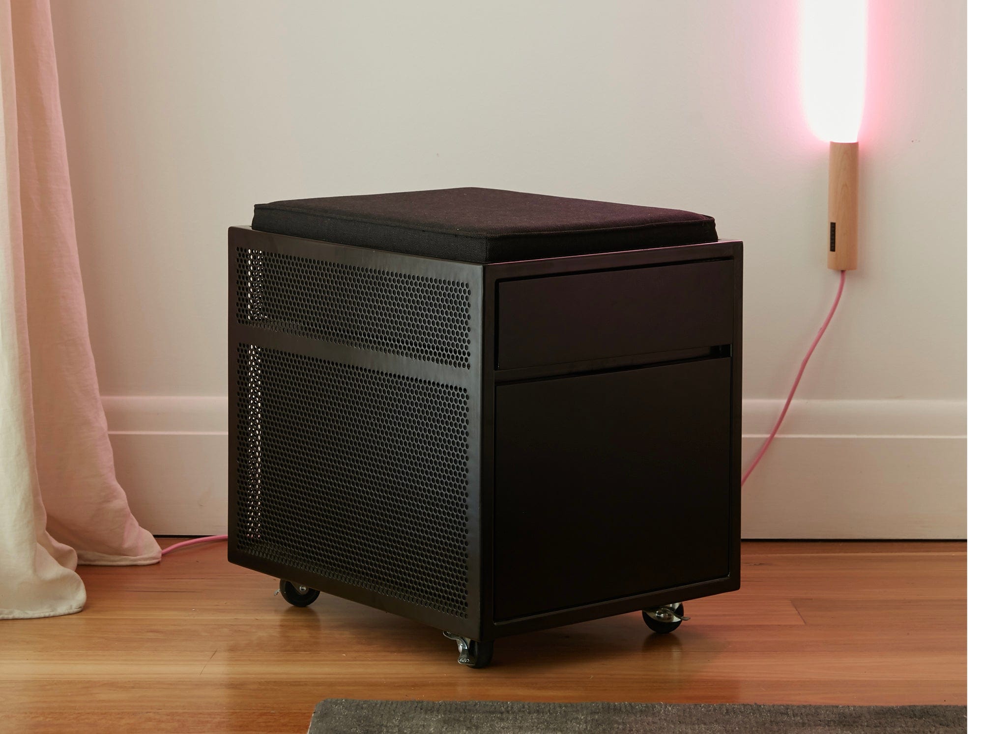 Let's get straight to it. I'm here to give your workspace a functional and aesthetical makeover. I'm an industrial 2 drawer pedestal desk unit on castors and with a seat cushion (I know, you're welcome), made up of a perforated steel powder-coated body, a comfy padded seat, and lacquered drawer fronts to match- the perfect accessory to any desk.