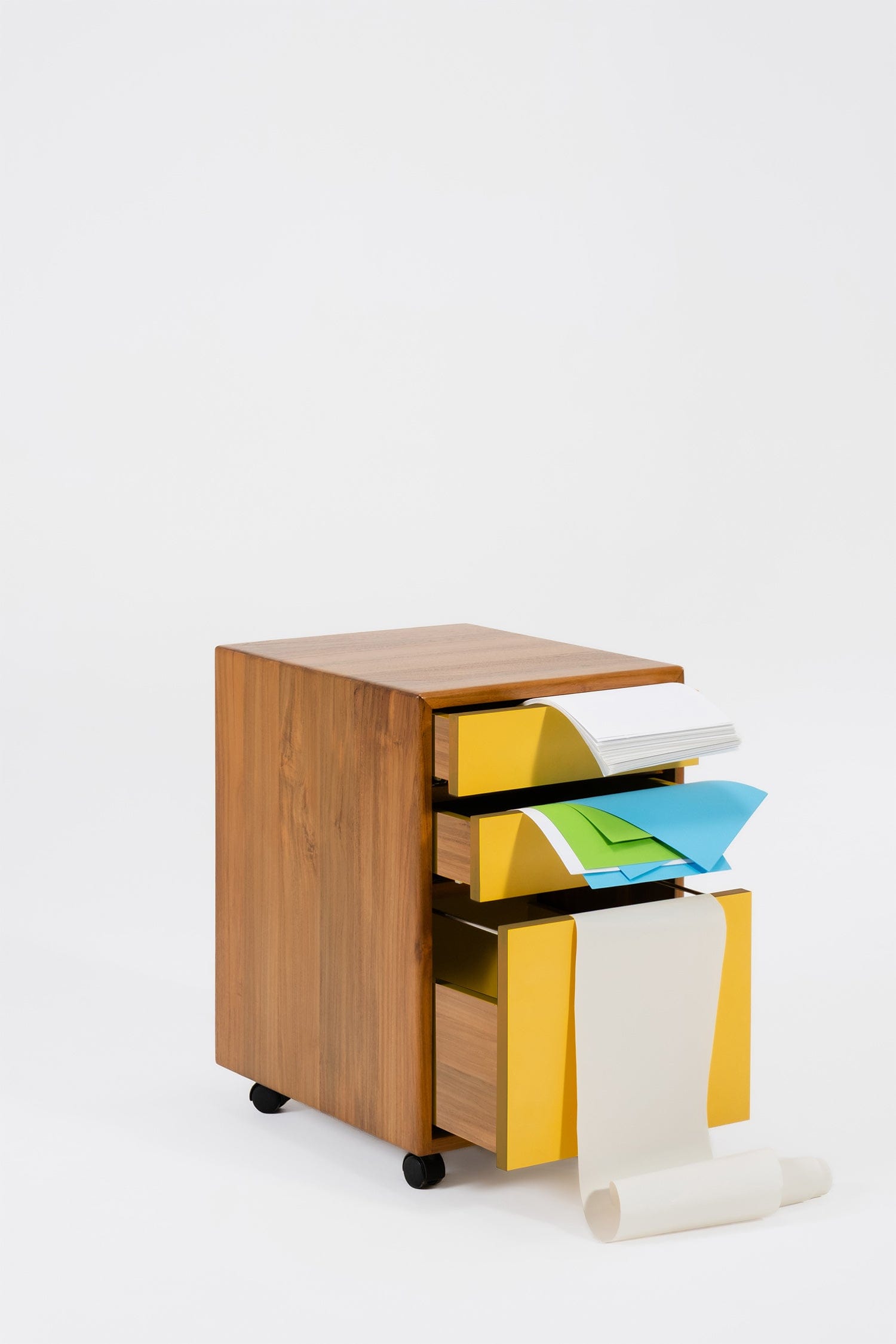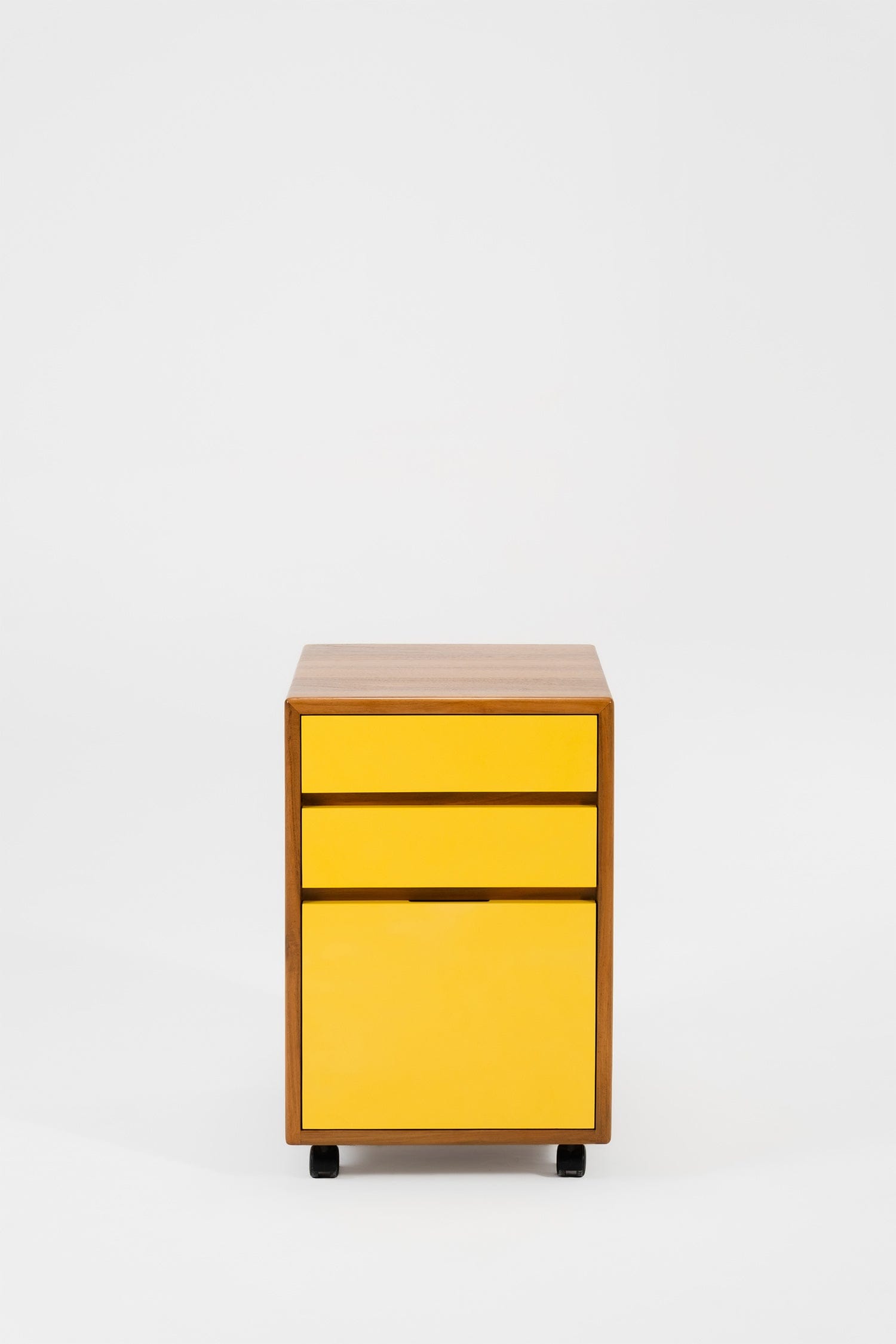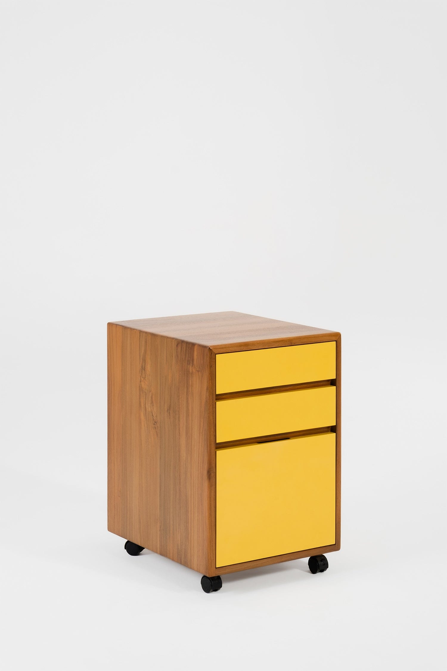If you're over sterile office storage, that's where I come in! I'm NCW, a warm and natural three-drawer pedestal unit, conveniently mobile on castors. My sturdy frame is built from solid reclaimed teak, and you can choose the perfect laminate finish for my drawer fronts. Think of me as the ideal blend of practicality and natural style for your workspace.