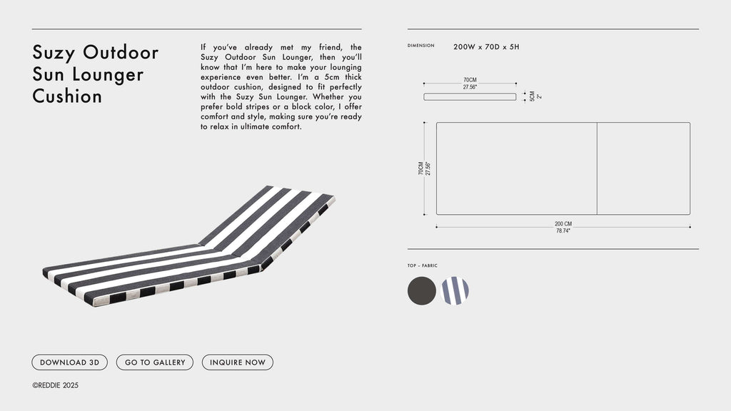 If you’ve already met my friend, the Suzy Outdoor Sun Lounger, then you’ll know that I’m here to make your lounging experience even better. I’m a 5cm thick outdoor cushion, designed to fit perfectly with the Suzy Sun Lounger. Whether you prefer bold stripes or a block color, I offer comfort and style, making sure you're ready to relax in ultimate comfort.