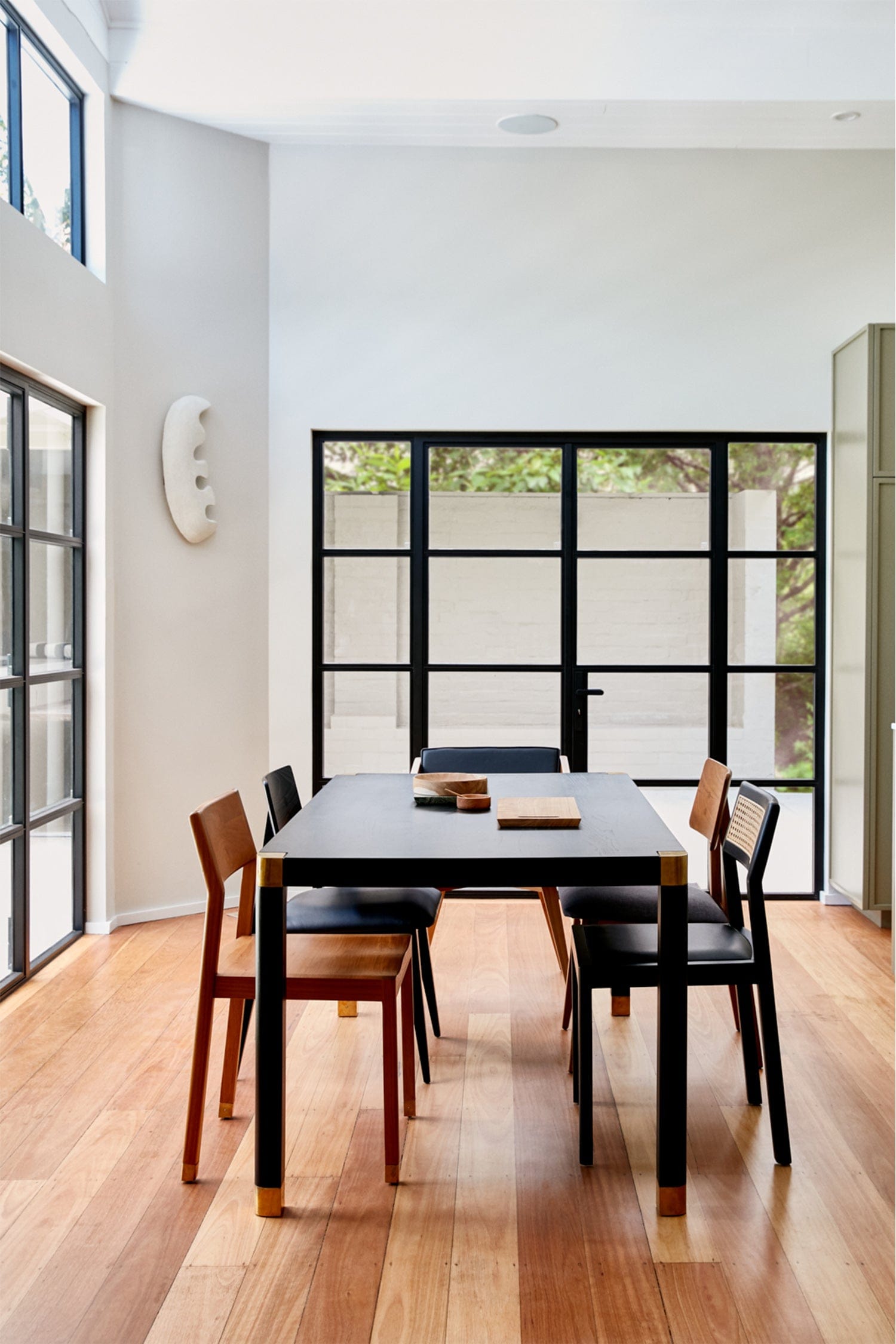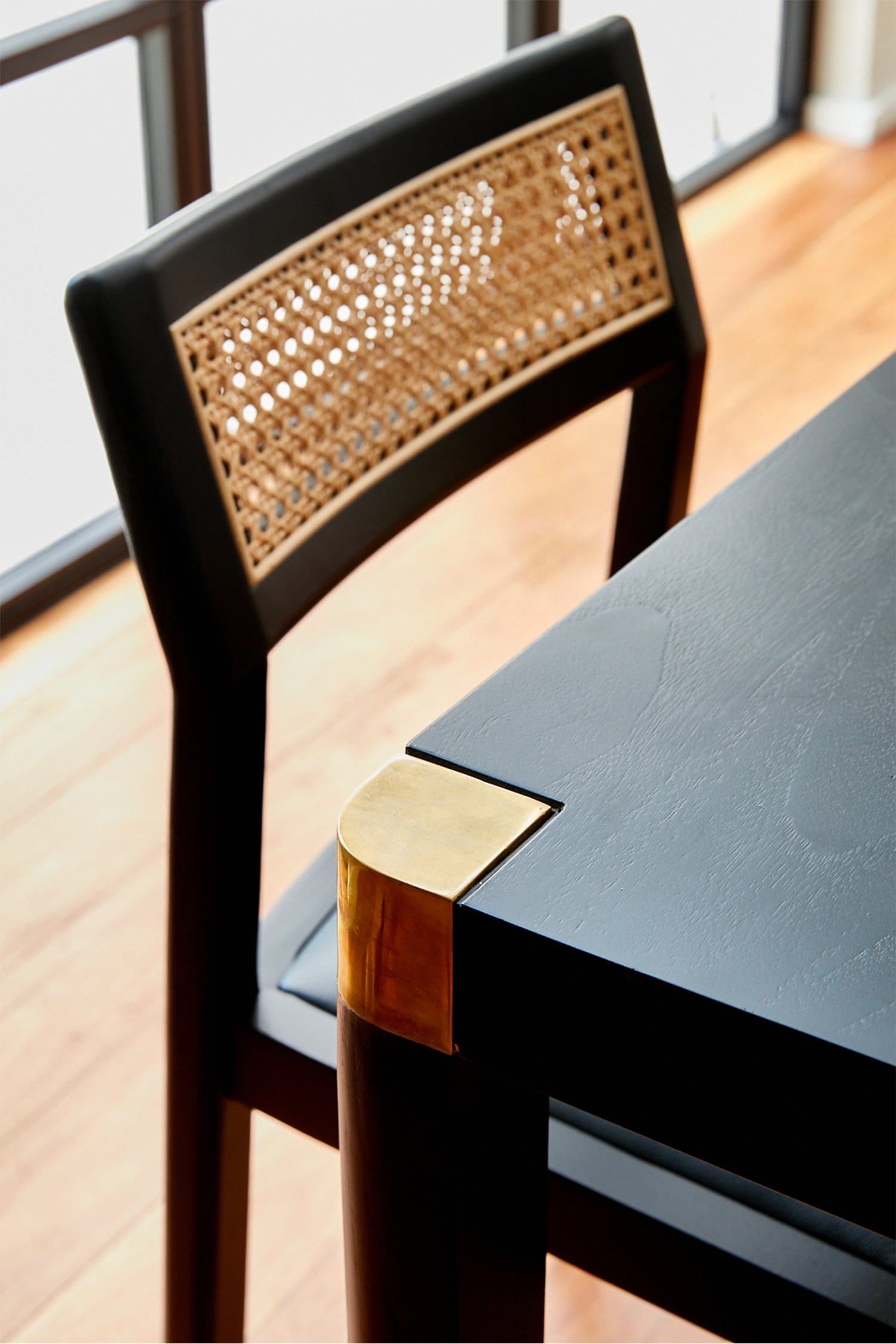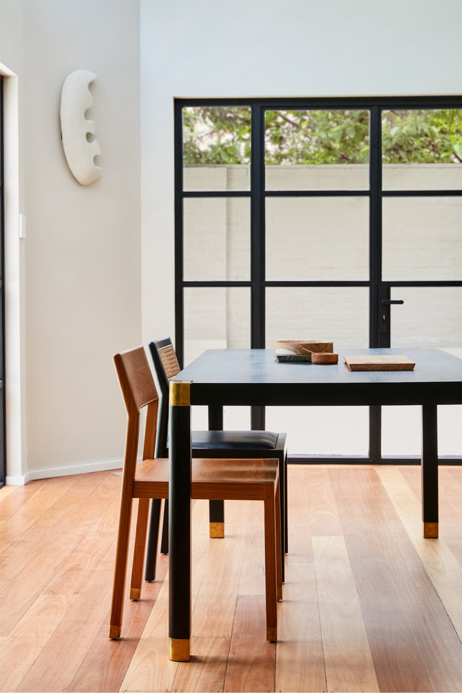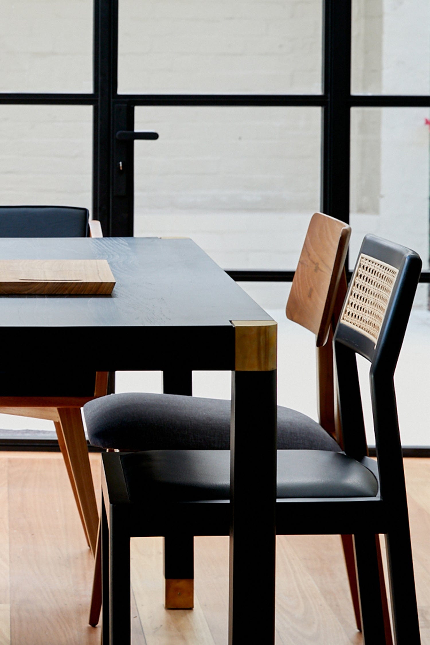 I’m Rita, a statement piece that combines elegance and practicality. My wood veneer top is paired with solid reclaimed teak legs, finished in a sleek black stain that enhances my natural grain. Brass metal corners and feet add a touch of art deco flair while offering added protection. Want to complete the set? I pair perfectly with the Rita Dining Chairs.