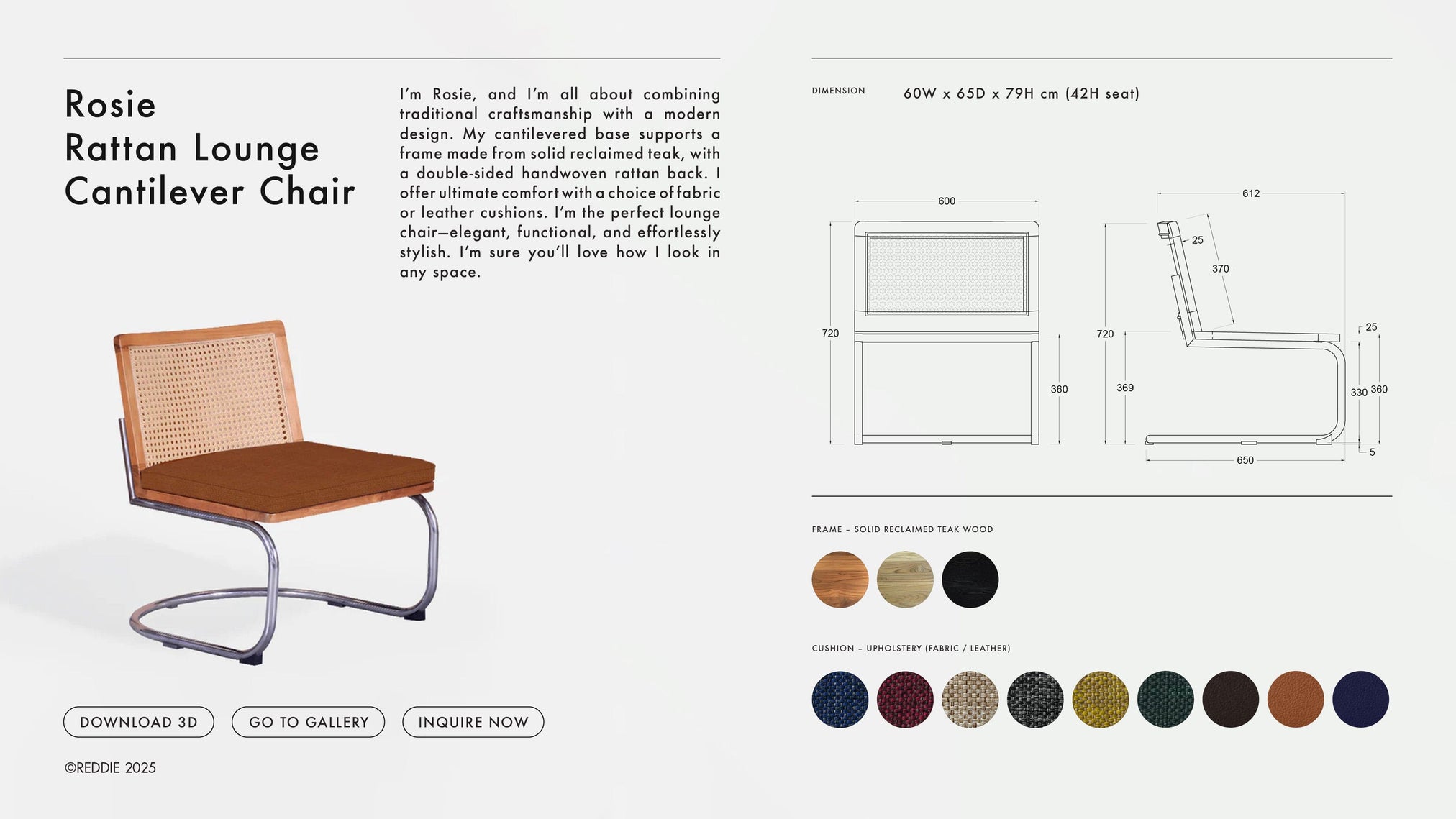I'm Rosie, and I'm all about combining traditional craftsmanship with a modern design. My cantilevered base supports a frame made from solid reclaimed teak, with a double-sided handwoven rattan back. I offer ultimate comfort with a choice of fabric or leather cushions. I’m the perfect lounge chair—elegant, functional, and effortlessly stylish. I’m sure you’ll love how I look in any space.