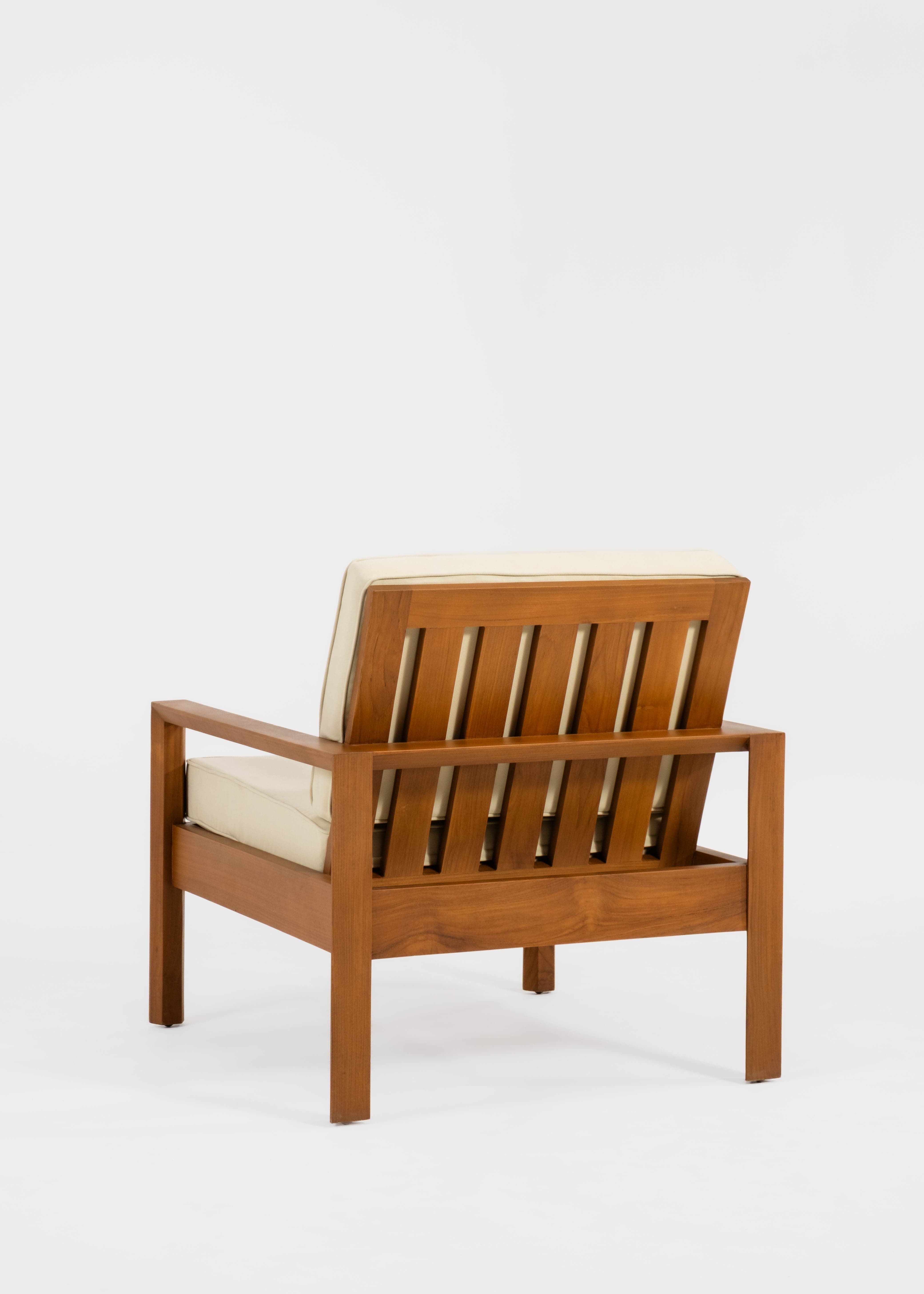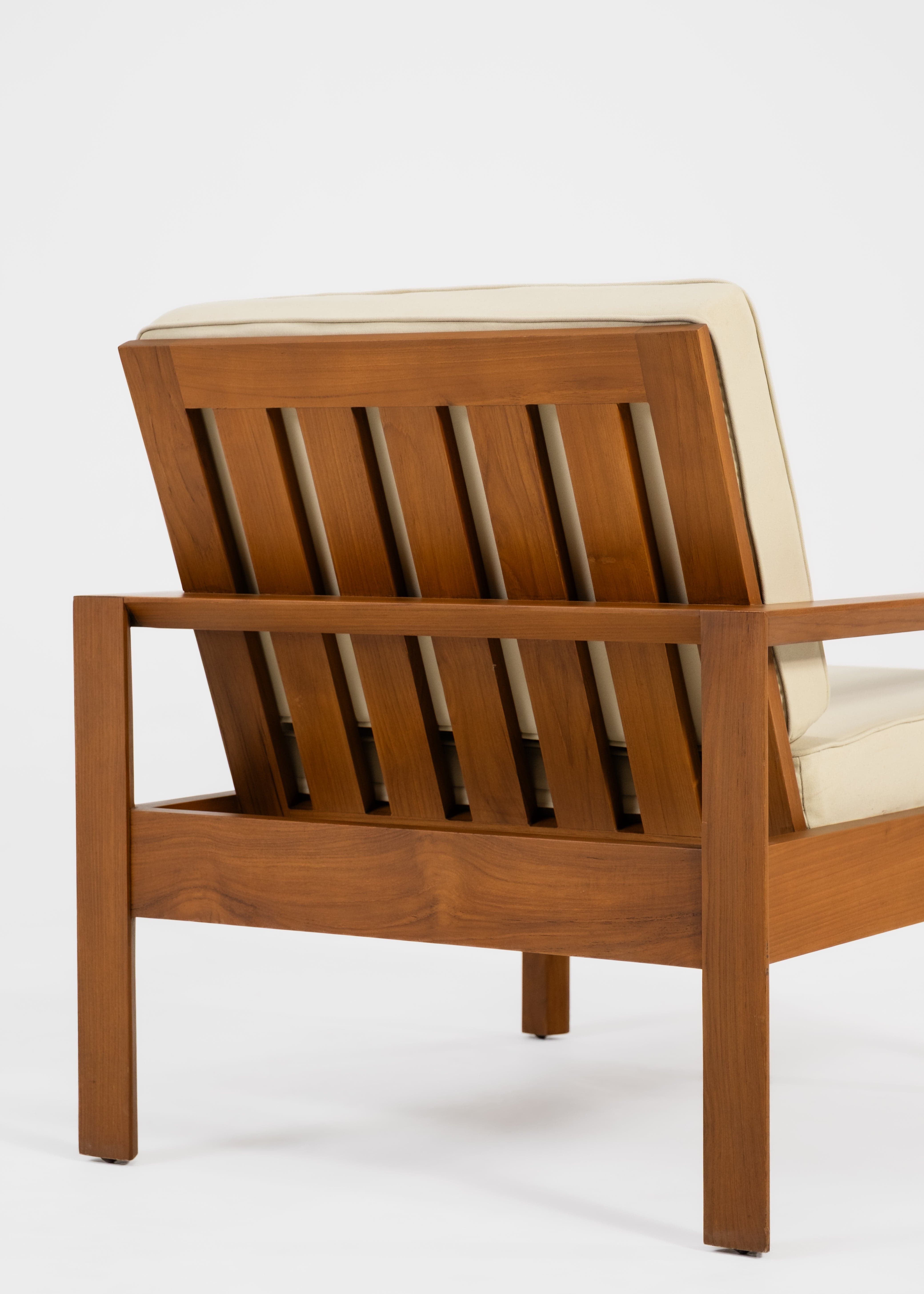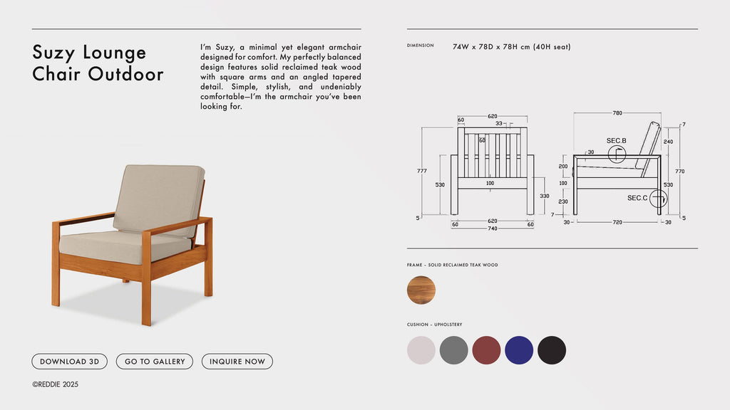I’m Suzy, a minimal yet elegant armchair designed for comfort. My perfectly balanced design features solid reclaimed teak wood with square arms and an angled tapered detail. Simple, stylish, and undeniably comfortable—I'm the armchair you've been looking for.