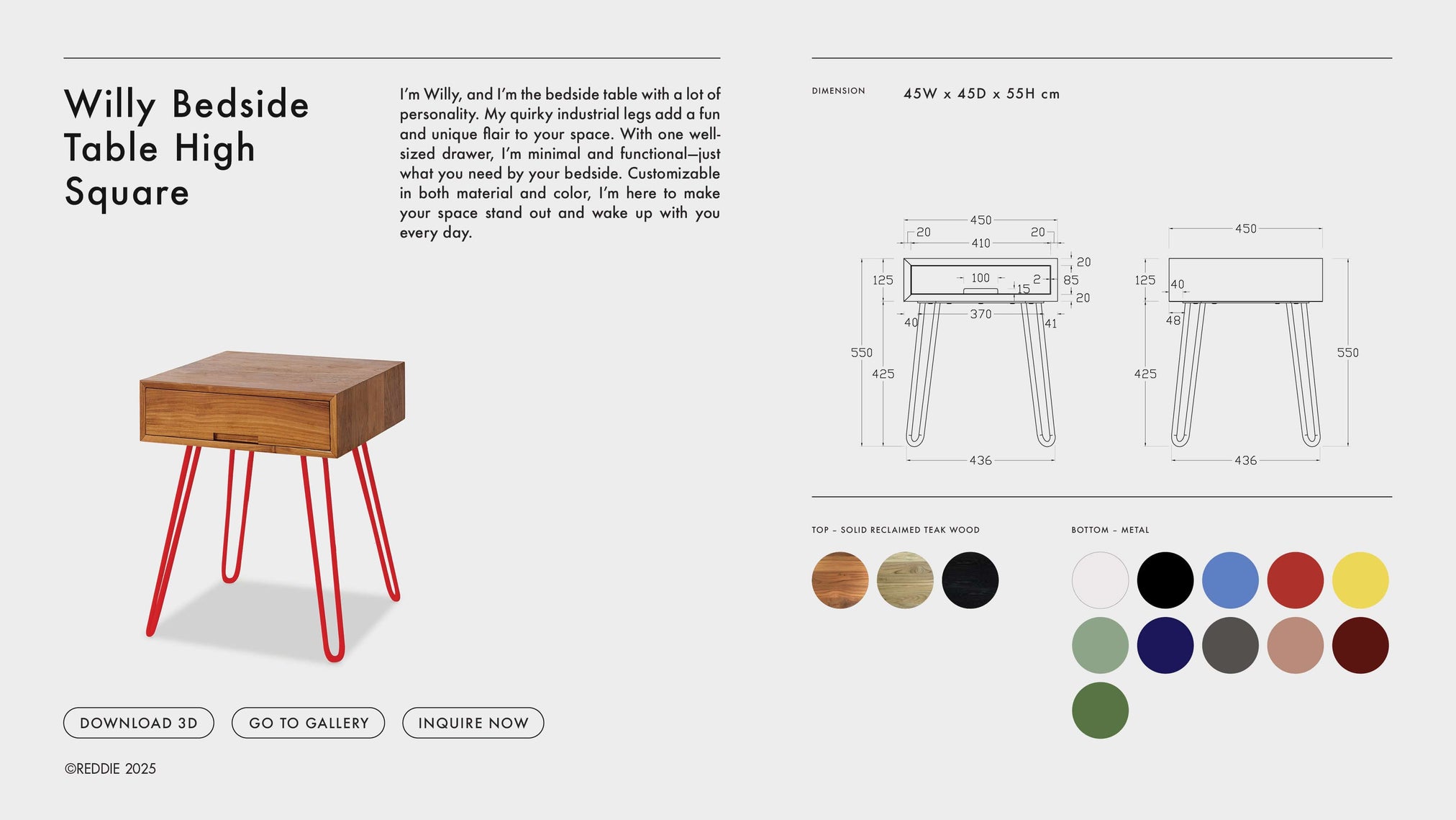 I’m Willy, and I’m the bedside table with a lot of personality. My quirky industrial legs add a fun and unique flair to your space. With one well-sized drawer, I’m minimal and functional—just what you need by your bedside. Customizable in both material and color, I’m here to make your space stand out and wake up with you every day.